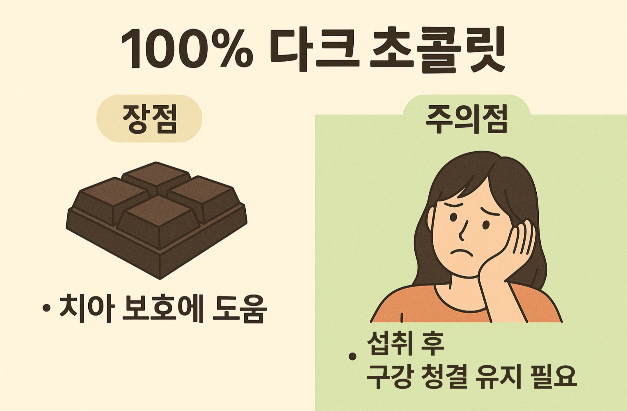 💡 다크 초콜릿은 어디까지나 '보조적인' 역할일 뿐, 치아 건강의 핵심은 꾸준한 구강 관리입니다.