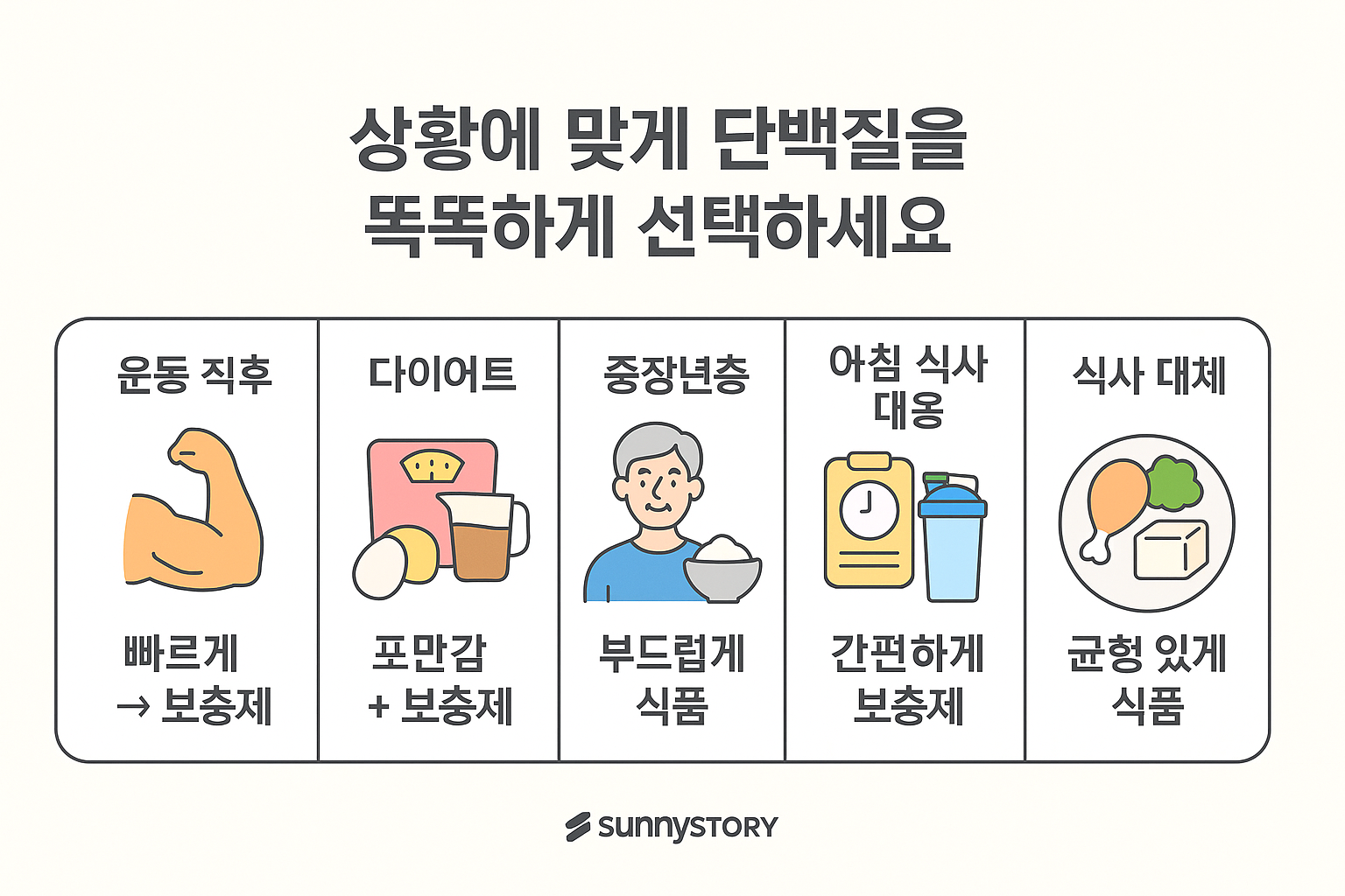 상황별 단백질 섭취 전략을 한눈에 정리했습니다.