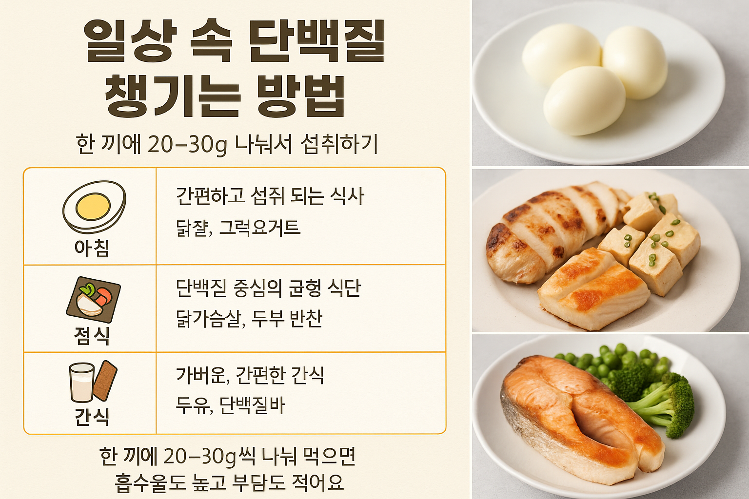 👉 한 끼에 단백질 20~30g씩 나눠서 섭취하면,흡수율도 높고 위에 부담도 적습니다.