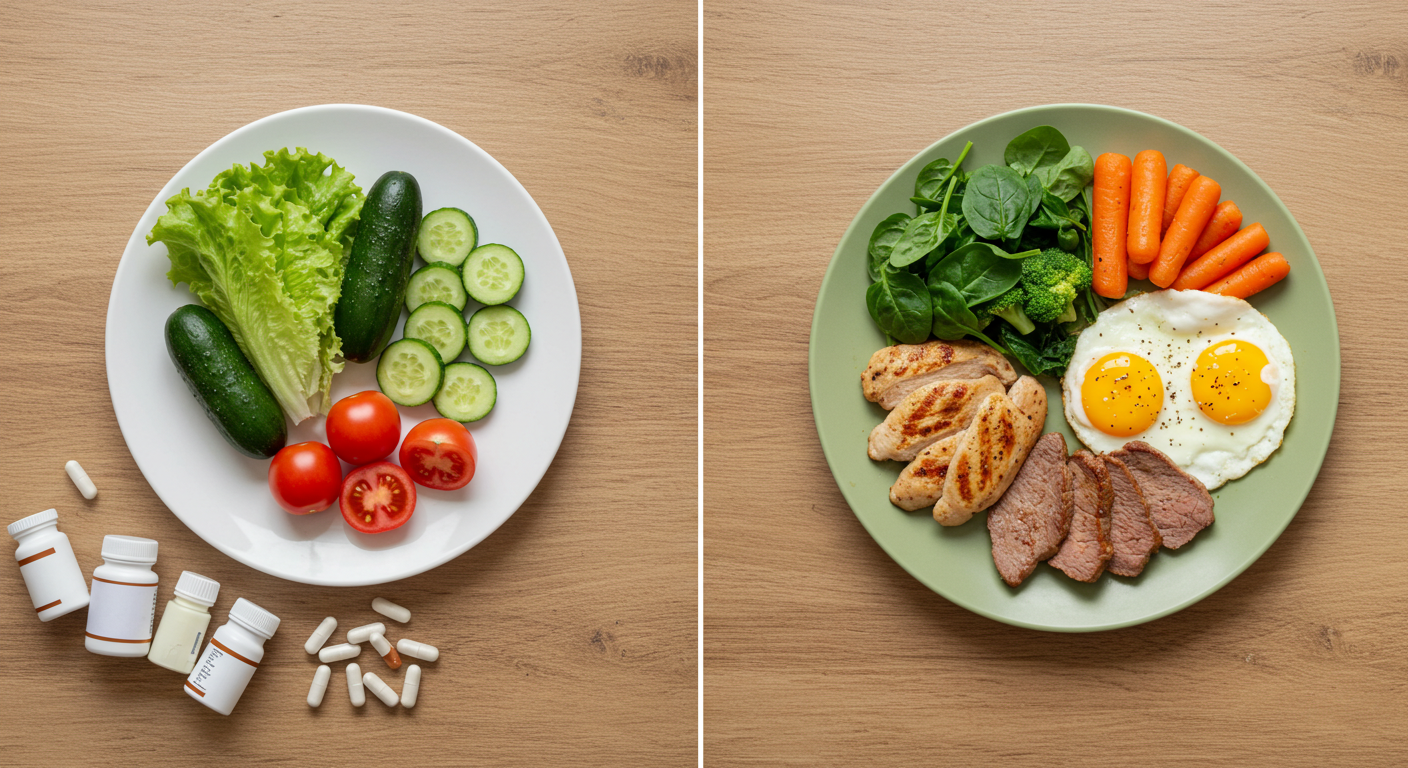 → 비타민 A는 지용성 비타민으로, 지방과 함께 섭취되어야 흡수가 잘 됩니다. 지방 섭취를 과도하게 제한하거나, 담즙 분비 이상, 소화 흡수 장애 등으로 인해 지방 흡수가 어려운 경우 비타민 A 결핍 위험이 커집니다. - ② 고기, 달걀, 유제품 등 동물성 식품을 거의 섭취하지 않는 경우