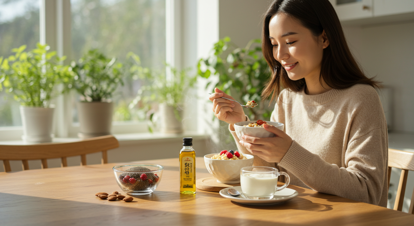 공복에 장 건강을 위해 귀리죽을 섭취하며 아침을 여는 건강한 루틴 장면